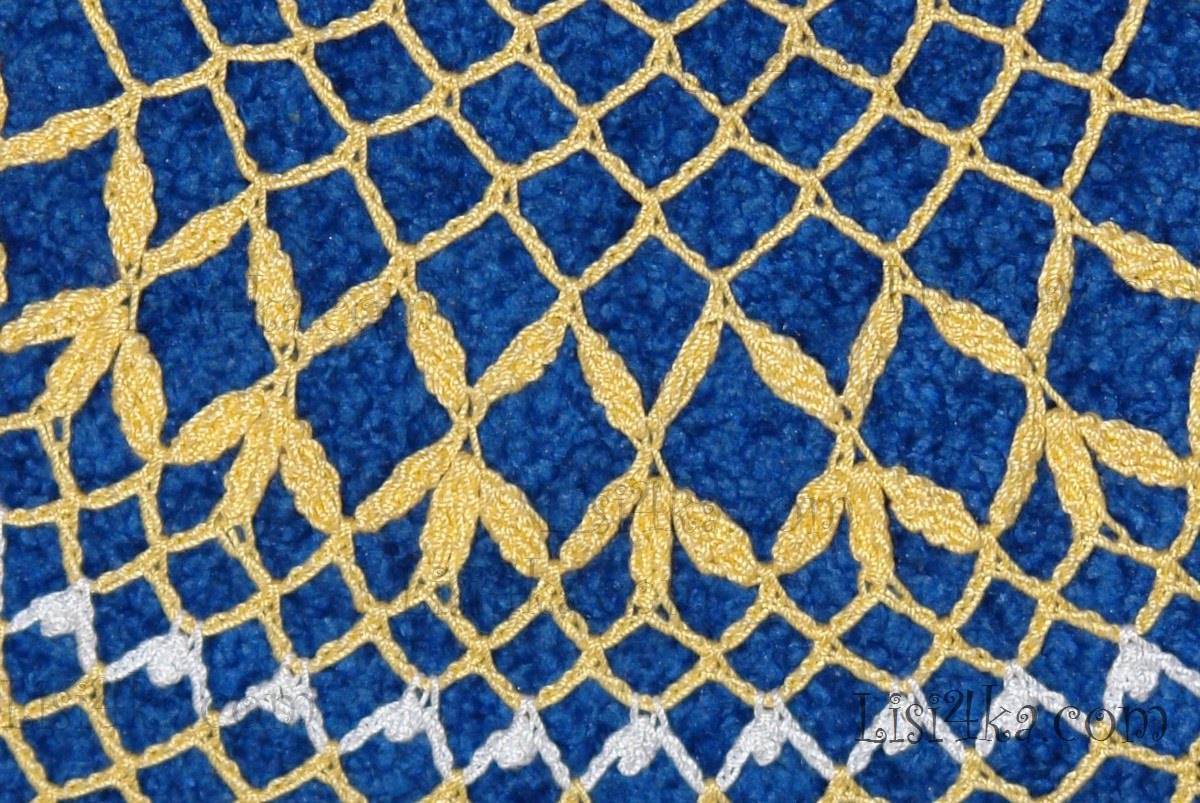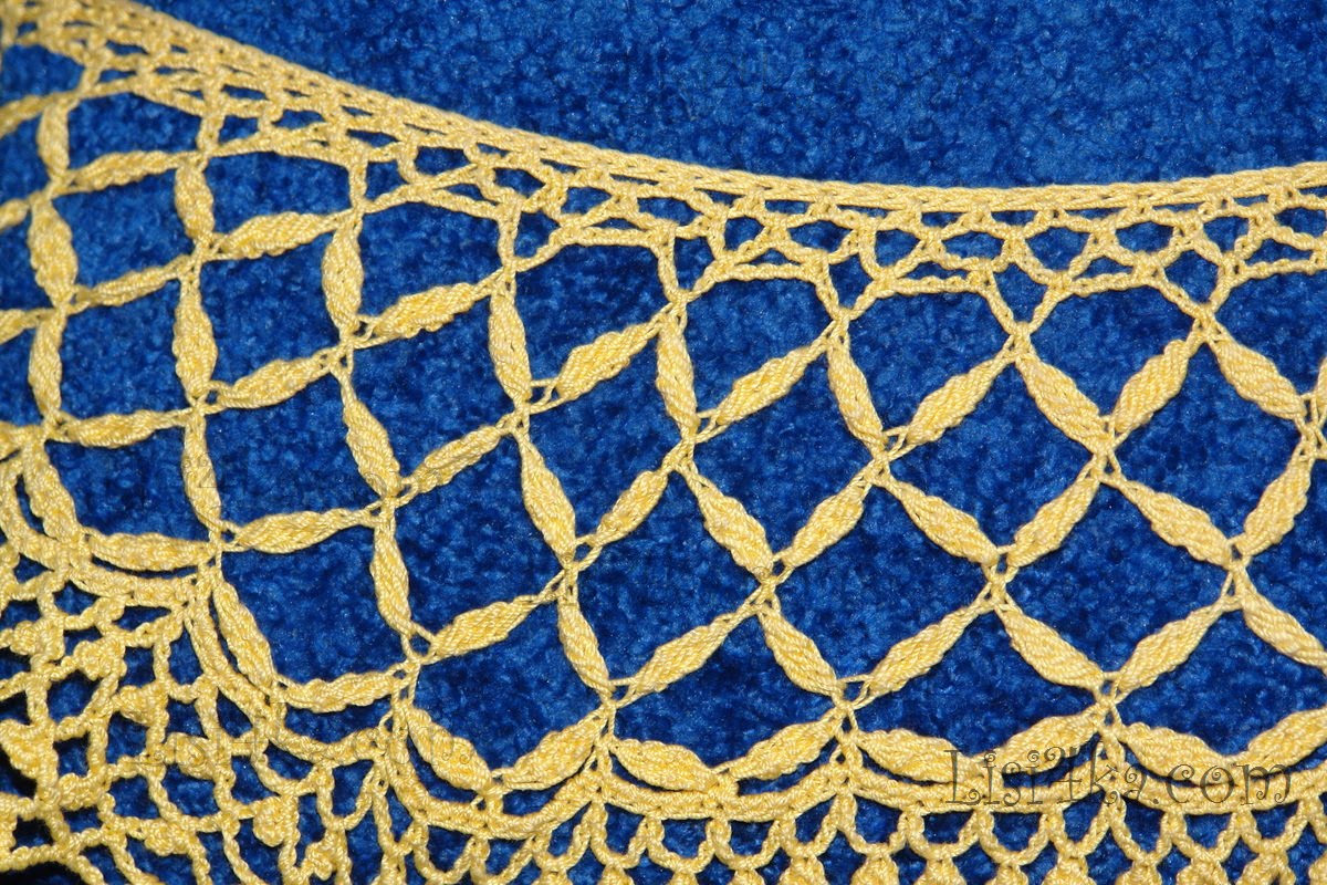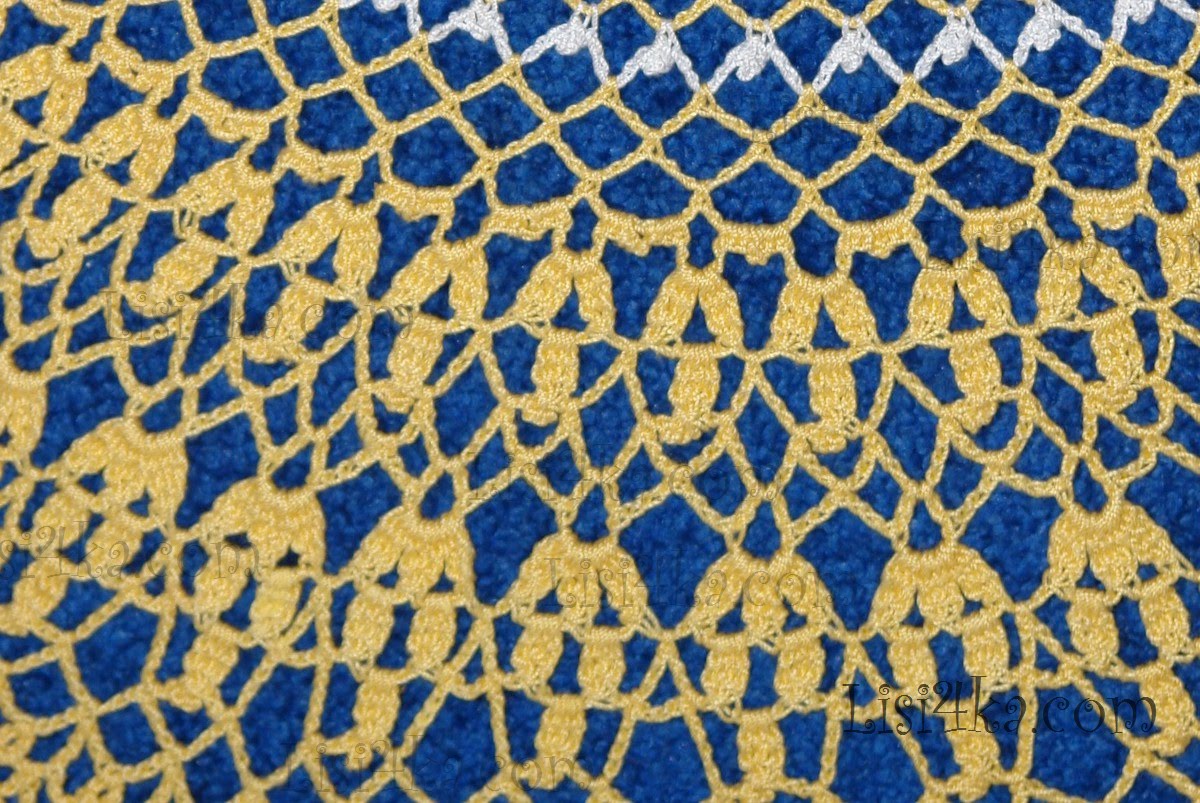 - тройной сокращённый столбик из столбиков с двумя накидами в следующую арочку из четырёх воздушных петель, между двумя столбиками с одним накидом. Продолжаем до конца ряда.